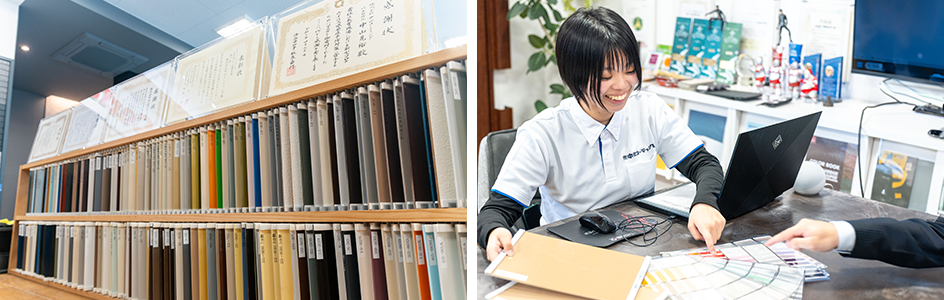 吉野川店は小規模ですが、お客様とじっくりお打ち合わせができるスペースがあり、外壁・屋根に関する資料や材料の展示もご用意しているため、実際に見て感じていただくことができます。