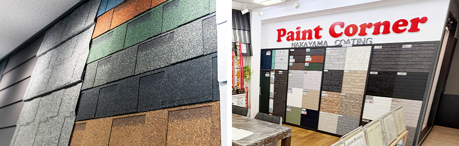 各塗料メーカー品や外壁・屋根材のサンプルを展示しており、比較検討することができます。屋根や外壁の構造を知り、塗り板見本では塗装されたリアルな質感・艶感に触れ、確かめることができます。