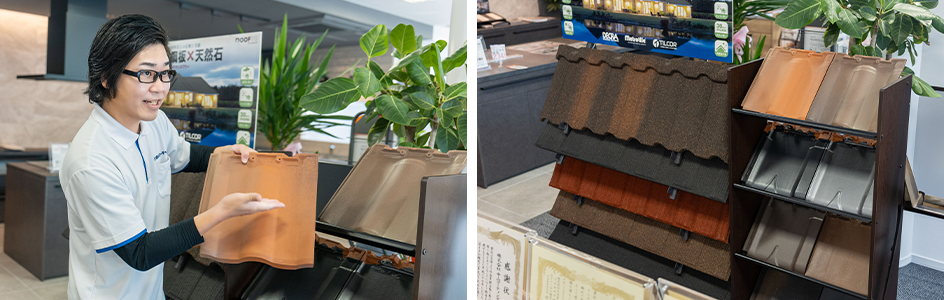 カラーパネルや、様々なメーカーの外壁や屋根の材料のサンプルを取り揃えており、質感を確認するだけでなく、外壁や屋根の構造も知ることができます。資料や色見本だけでなく、どのような屋根・外壁のイメージになるかカラーシミュレーションをすることも可能です。