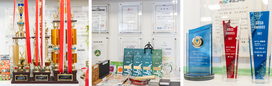 ショールームには中山コーティングの今までの施工事例はもちろん、各塗料メーカーや団体からいただいた表彰の展示もしているため、実績を確かめて安心していただくことができます。