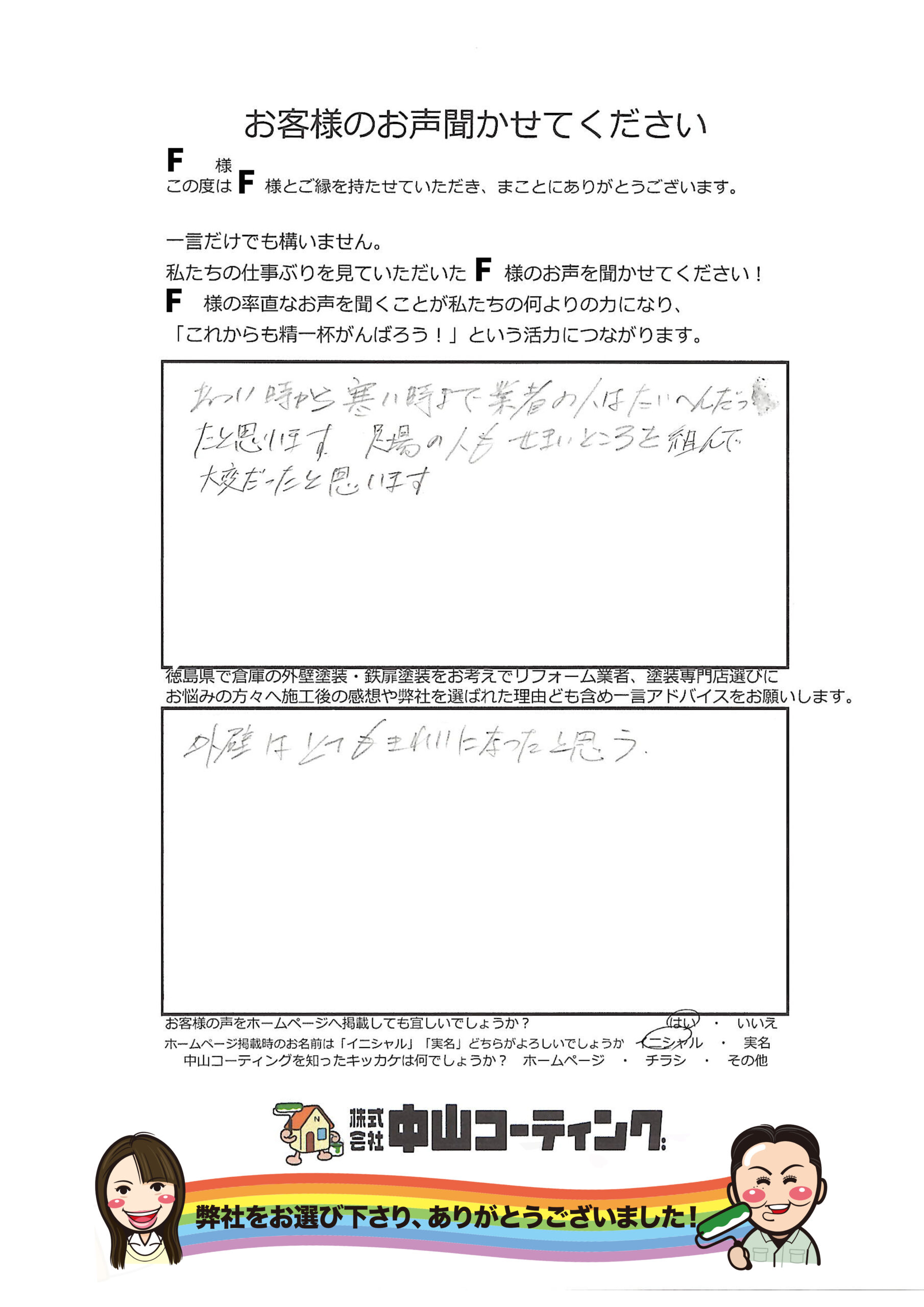 阿南市才見町 F様 外壁塗装 見違えるほど、美しく。厳しい現場を支えた技術力が、理想の住まいを叶えてくれました。 ご提案した塗料の紹介。 関西ペイント|RSシルバーグロスSi 19-90A ツヤあり 私たちの仕事ぶりを見ていただいたF様のお声をお聞かせください! 暑い時から寒い時まで業者の人は大変だったと思います。 足場の人も狭い所を組んで大変だったと思います。 徳島県で倉庫の外壁塗装・鉄扉塗装をお考えでリフォーム業者、塗装専門店選びにお悩みの方々へ、施工後の感想や弊社を選ばれた理由なども含め、一言アドバイスをお願いします。 外壁はとてもきれいになったと思う。 ORDER このお客様の施工内容 徳島県阿南市 M様 美観長持ちの外壁へ。RSシルバーグロスで上質仕上げ。 地域別阿南市施工種別外壁塗装リフォーム住宅別住宅塗装リフォーム 前の記事 次の記事 一覧へ戻る