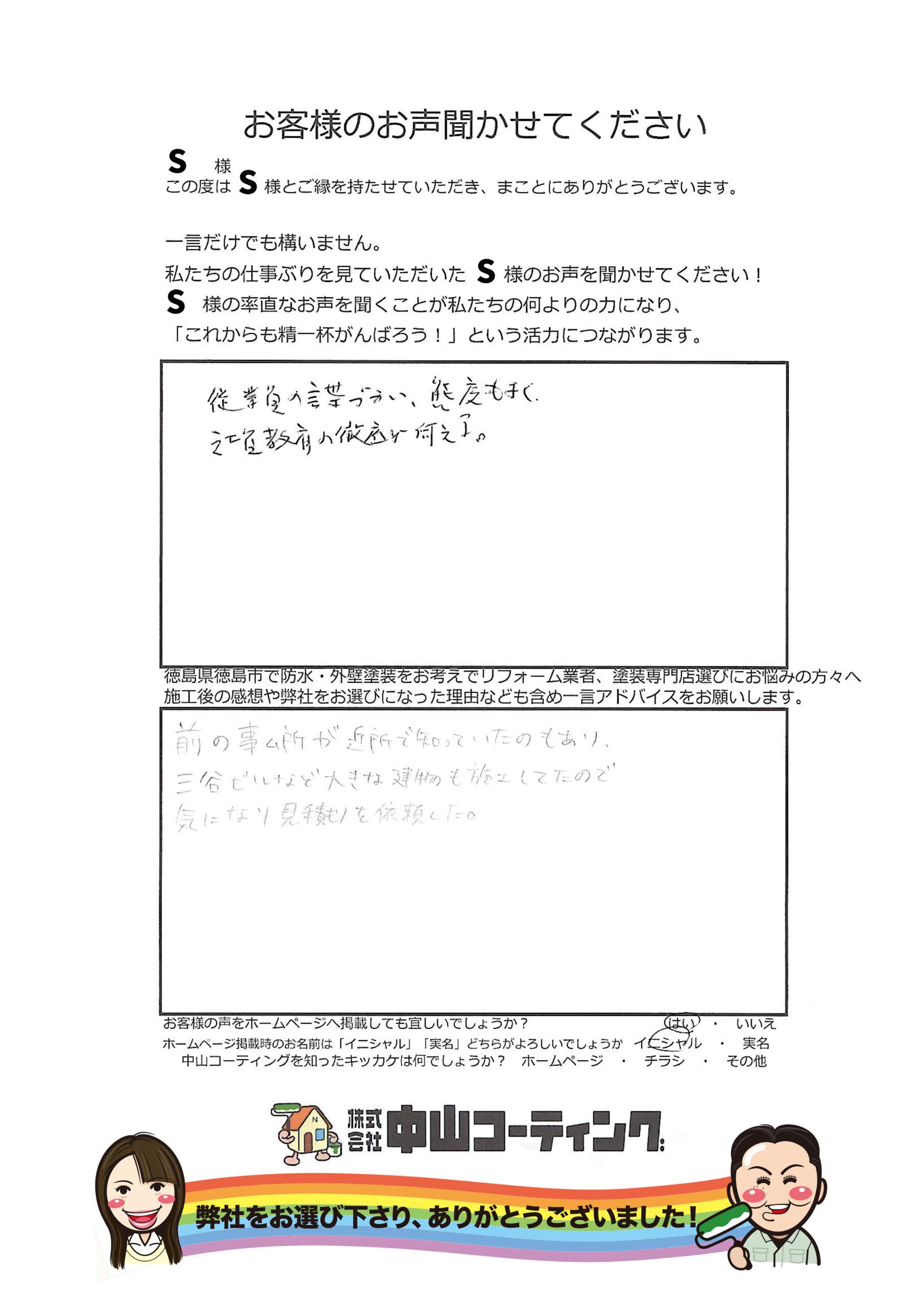 徳島市中昭和町 S様 鉄筋住宅の外壁塗装ひび割れや膨れも解決 お客様の声 挨拶ひとつで、仕事の質がわかる。徹底した社員教育が育む、安心の施工品質。 ご提案した塗料の紹介。 外壁|関西ペイント|プライムProグロス KP-110 私たちの仕事ぶりを見ていただいたS様のお声をお聞かせください! 従業員の言葉遣い、態度も良く、社員教育の徹底が伺える。 徳島県徳島市で防水・外壁塗装をお考えでリフォーム業者、塗装専門店選びにお悩みの方々へ、施工後の感想や弊社を選んだ理由なども含め、一言アドバイスをお願いします。 前の事務所が近所なので知っていたのもあり、三谷ビルなど大きな建物も施工していたので、気になり見積りを依頼した。 前の記事 次の記事 一覧へ戻る