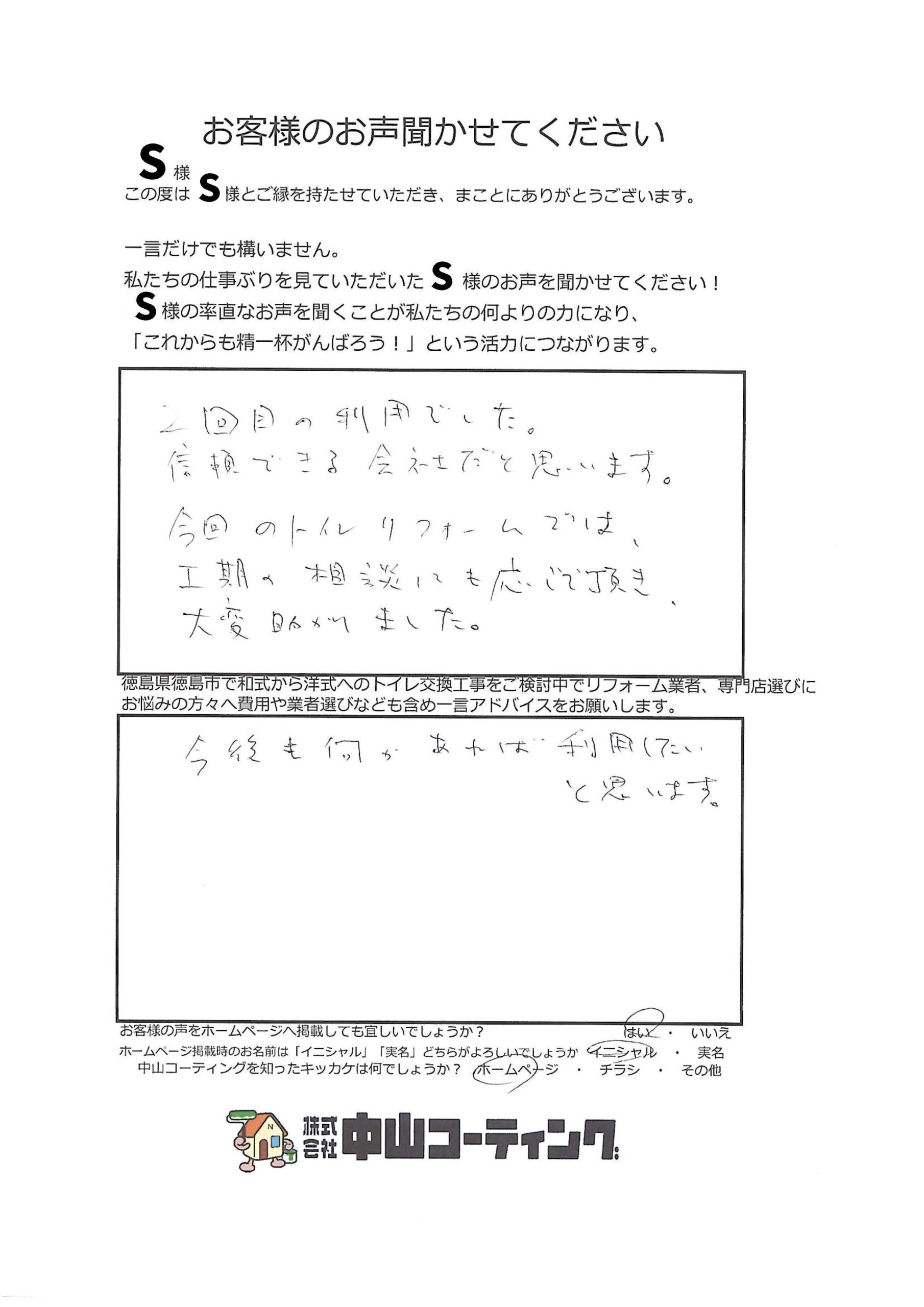 お客様とのご縁を、次の塗装へつなぐ「徳島市O町 S様」 お客様とのご縁を、次の塗装へつなぐ 私たちの仕事ぶりを見ていただいたS様のお声をお聞かせください! 2回目の利用でした。 信頼できる会社だと思います。 今回のトイレリフォームでは工期の相談にも応じて頂き大変助かりました。 徳島県徳島市で和式から洋式へのトイレ交換工事をご検討中でリフォーム業者、専門店選びにお悩みの方々へ、費用や業者選びなども含め、一言アドバイスをお願いします。 今後も何かあれば利用したいと思います。 前の記事 次の記事 一覧へ戻る