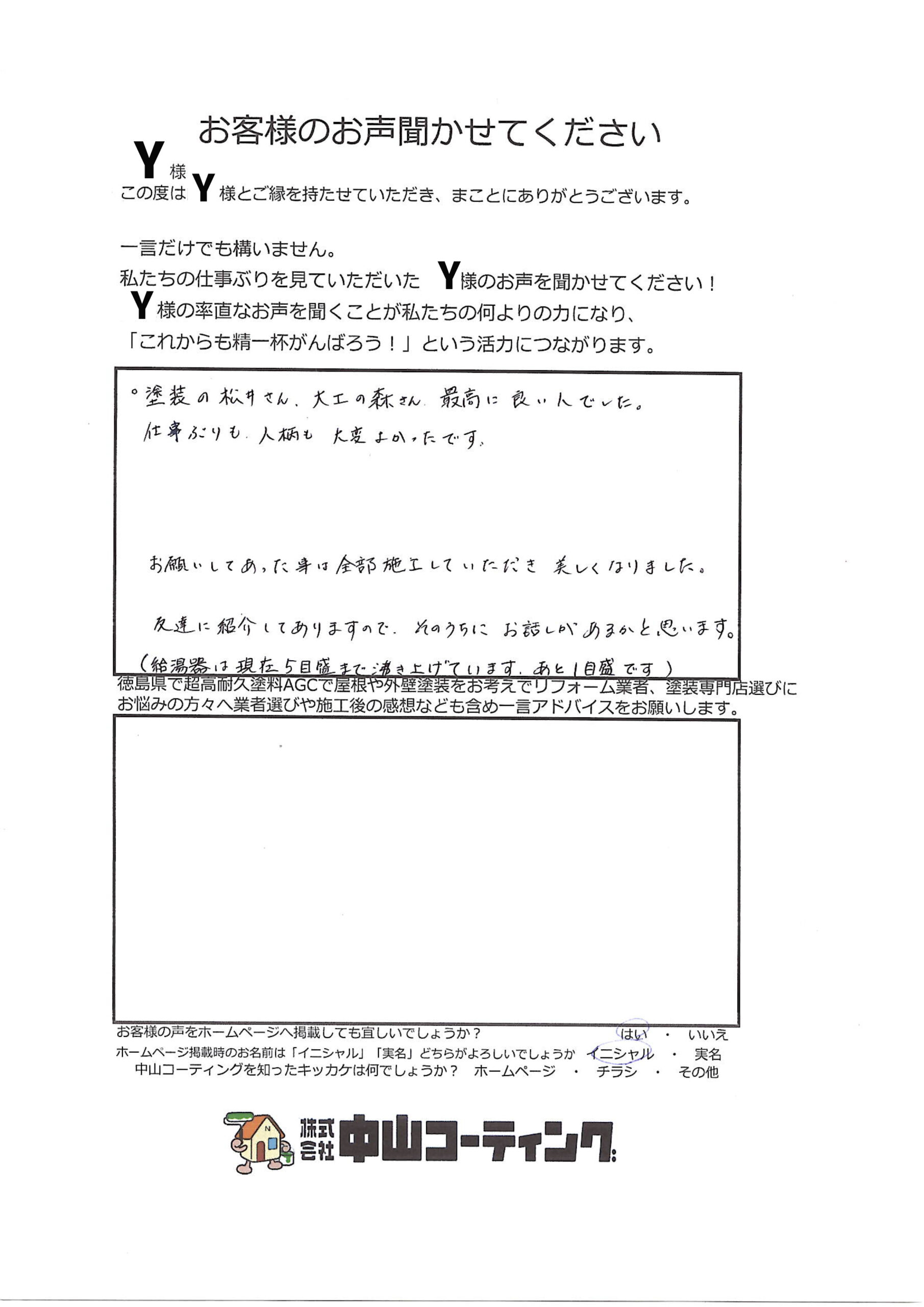 「“またお願いしたい”その一言が、私たちの誇りです「徳島市H町 Y様」 「“またお願いしたい”その一言が、私たちの誇りです ご提案した塗料の紹介 外壁|ボンフロン㈱|ボンフロン弱溶剤エナメル|19-85D 屋根|ボンフロン㈱|ボンフロン弱溶剤|NC19-054 私たちの仕事ぶりを見ていただいたY様のお声をお聞かせてください! ・塗装の松井さん、大工の森さん最高に良い人でした。仕事ぶりも人柄も大変良かったです。 お願いしてあったことは全部施工していただき美しくなりました。(テラスの上の水洗いをお願いするのを忘れており残念です) 友達に紹介してありますので、そのうちにお話しがあるかと思います。(給湯器は現在5目盛まで沸き上げています。あと1目盛です) 前の記事 次の記事 一覧へ戻る