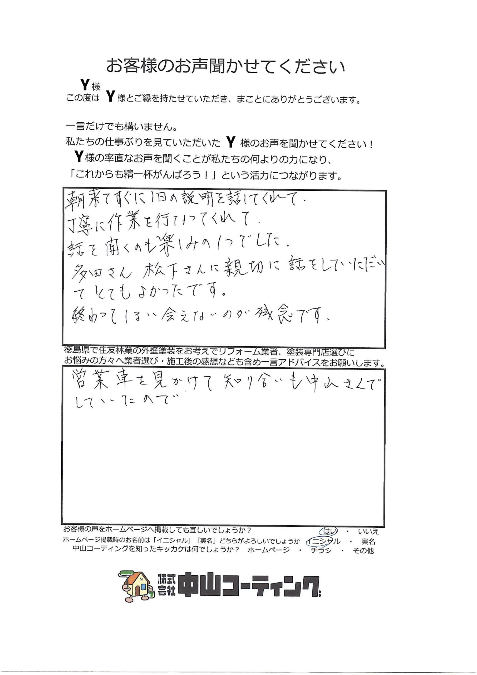 “人”で選ばれる塗装店が、最後に選ばれます「徳島市S町 Y様」 “人”で選ばれる塗装店が、最後に選ばれます ご提案した塗料の紹介 外壁|菊水化学工業|キクスイグラストSi|グラストsi5623 私たちの仕事ぶりを見ていただいたY様のお声をお聞かせてください! 朝来てすぐに1日の説明を話してくれて 丁寧に作業を行ってくれて 話を聞くのも楽しみの1つでした。 多田さん松下さんに親切に話をしていただいて とてもよかったです。 終わってしまい会えないのが残念です。 徳島県で住友林業の外壁塗装をお考えでリフォーム業者、塗装専門店選びにお悩みの方々へ、業者選び・施工後の感想なども含め、一言アドバイスをお願いします。 営業車を見かけて知り合いも中山さんでしていたので 前の記事 次の記事 一覧へ戻る