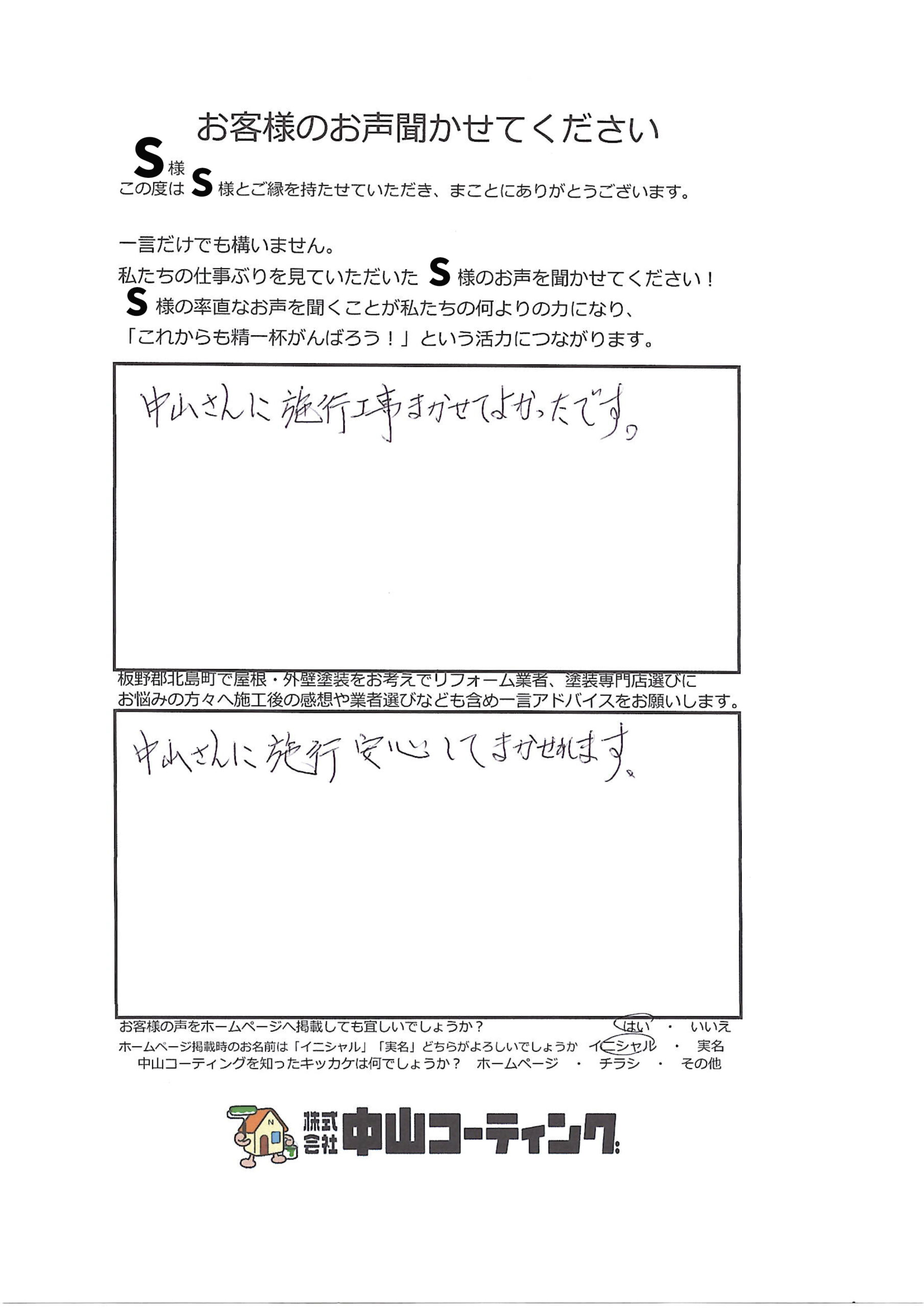 “中山コーティングに任せてよかった”とお声をいただきました「板野郡K町 S様」 “中山コーティングに任せてよかった”とお声をいただきました ご提案した塗料の紹介 外壁|関西ペイント㈱|ダイナミックTOPマイルド|22-90B 屋根|関西ペイント㈱|RSルーフマイルド|スチールグレー 私たちの仕事ぶりを見ていただいたS様のお声を聞かせてください! 中山さんに施工工事まかせてよかったです。 板野郡北島町で屋根・外壁塗装をお考えでリフォーム業者、塗装専門店選びにお悩みの方々へ施工後の感想や業者選びなども含め一言アドバイスをお願いします。 中山さんに施工安心してまかせれます。 前の記事 一覧へ戻る