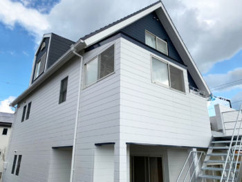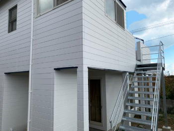 | ご提案内容 | 訪問販売でお困りでお困りと事でお悩みをお聞きしました。 ベランダが狭いので幅を拡げたいとの事で大工工事を行いリノベーションを行い、新設階段には融合亜鉛メッキ処理を行い錆にも強い仕様となりました。 外壁塗装にはグリーンゲイブルズ風ダークブルーゲイブルズに塗装作業を行いました。 既存瓦には現カスコ様のモーランルーフが葺かれておりました。こちらも塗装を行い撥水効果・耐久性も見込める仕様となります。 |