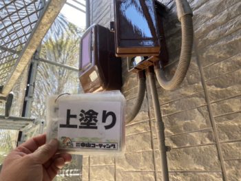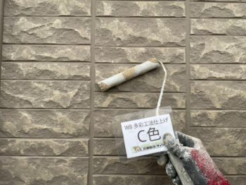 外壁の塗り替え仕様がWB多彩仕上げ工法という特殊な工法で、シミュレーションが困難なため現地にて実際に見本を塗布しました。