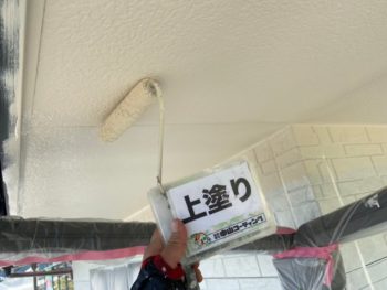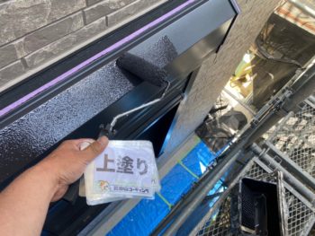 軒天井部分は湿気を逃がす為に艶消しの専用塗料にて塗装を行っております。素材が金属の部分には下塗りに錆止めを使用し防さび効果を付与、塩ビシートが被覆しているシャッターボックスには下塗りで特殊なプライマーを塗布しています。
