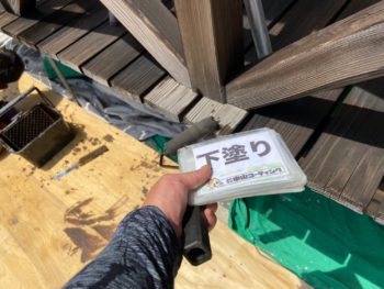まずはケレン作業を行い汚れをある程度除去し、清掃後に木部専用塗料の「ガードラックアクア」を塗布しました。