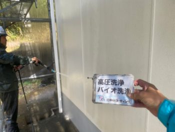 建物全体の高圧洗浄を行いました。コケや藻、劣化した旧塗膜などをしっかり取り除き塗料の付着が良くなるように丁寧に洗い上げます。