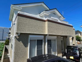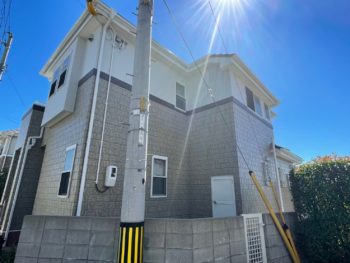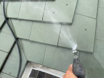 建物全体の高圧洗浄を行いました。コケや藻、劣化した旧塗膜などをしっかり取り除き塗料の付着が良くなるように丁寧に洗い上げます。