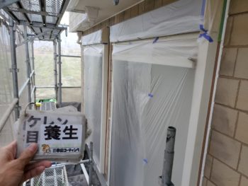 鼻隠し下塗りの様子です。今回は細かいひび割れを隠すように隠蔽性のある下塗りを使用しています。