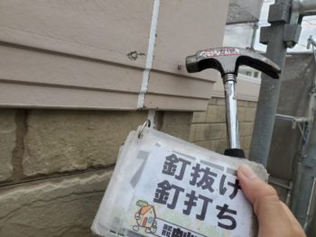 外壁を止めている釘が浮いています。鉄の釘も膨張と収縮はしますので、ずっと置いておくと徐々に抜けてきます。