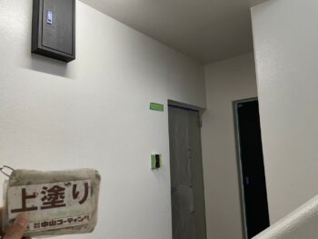 共有部である踊り場にはオーナー様もお困りになっていた水たまりを解消するべく長尺シートにて施工。