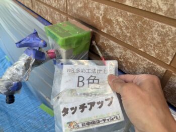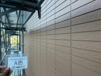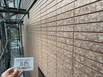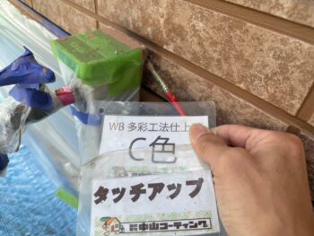 以前、モ二エル瓦の塗装をしているとの事でドローンを飛ばし撮影画像を確認すると洗浄不足でスラリー層が残っておりました。下地調整が大事なので念入りに行い今後安心できる屋根瓦になりました。外壁はクリアー塗装不可の為、意匠性・耐久性・対候性を備えたWB多彩工法仕上げで仕上げました。単一色だけでない柄付きはお客様にとても好評で大満足のお言葉をいただきました。