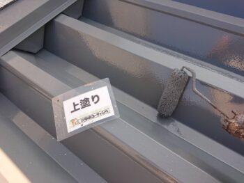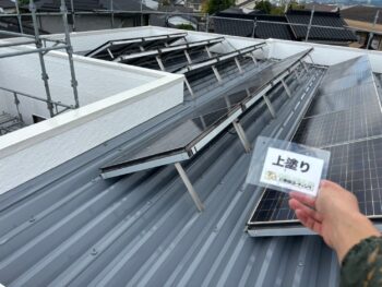 徳島県内、数ある塗装業者の中から弊社をご指名いただきありがとうございます。今回、お父様がDIYで塗られておりそのまま塗るとリフティング(既存塗膜の膨れ)が懸念されることから下地調整を行い適した下塗り塗料後に決められた色中塗り上塗りを行いました。折半屋根にはボルトキャップを取付、雨漏りや錆の心配がなくなります。改修工事時セキスイハイムの弱点も施工行いました。